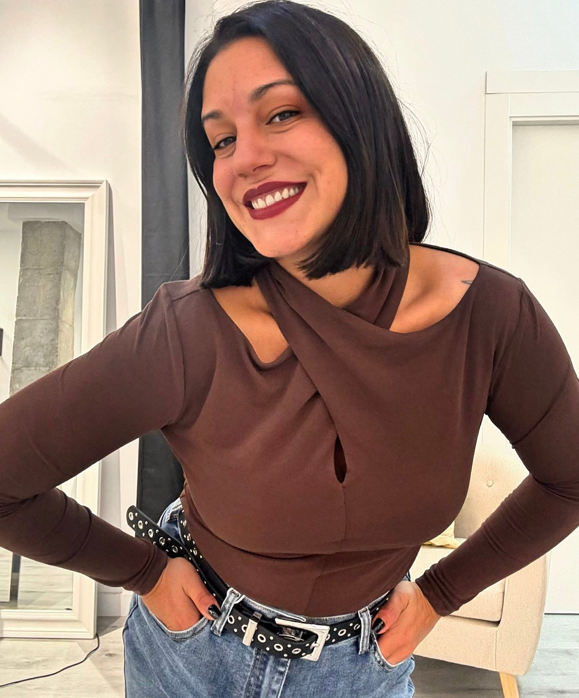 Body marrón con escote cruzado que aporta un toque elegante y moderno. Ajustado y versátil, ideal para combinar con pantalones, faldas o jeans para looks de día o noche 🍂🖤.