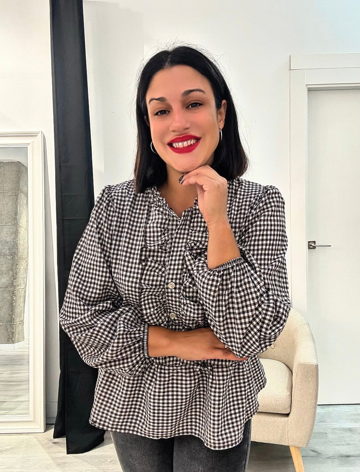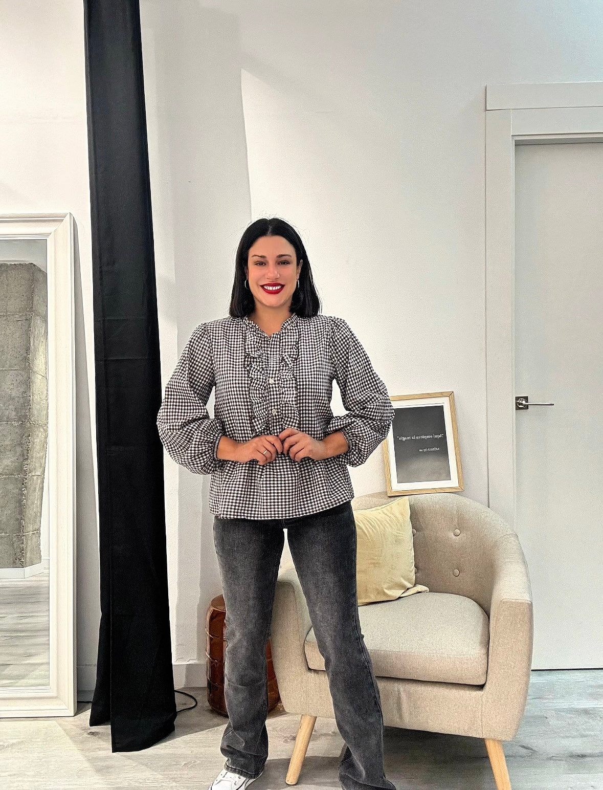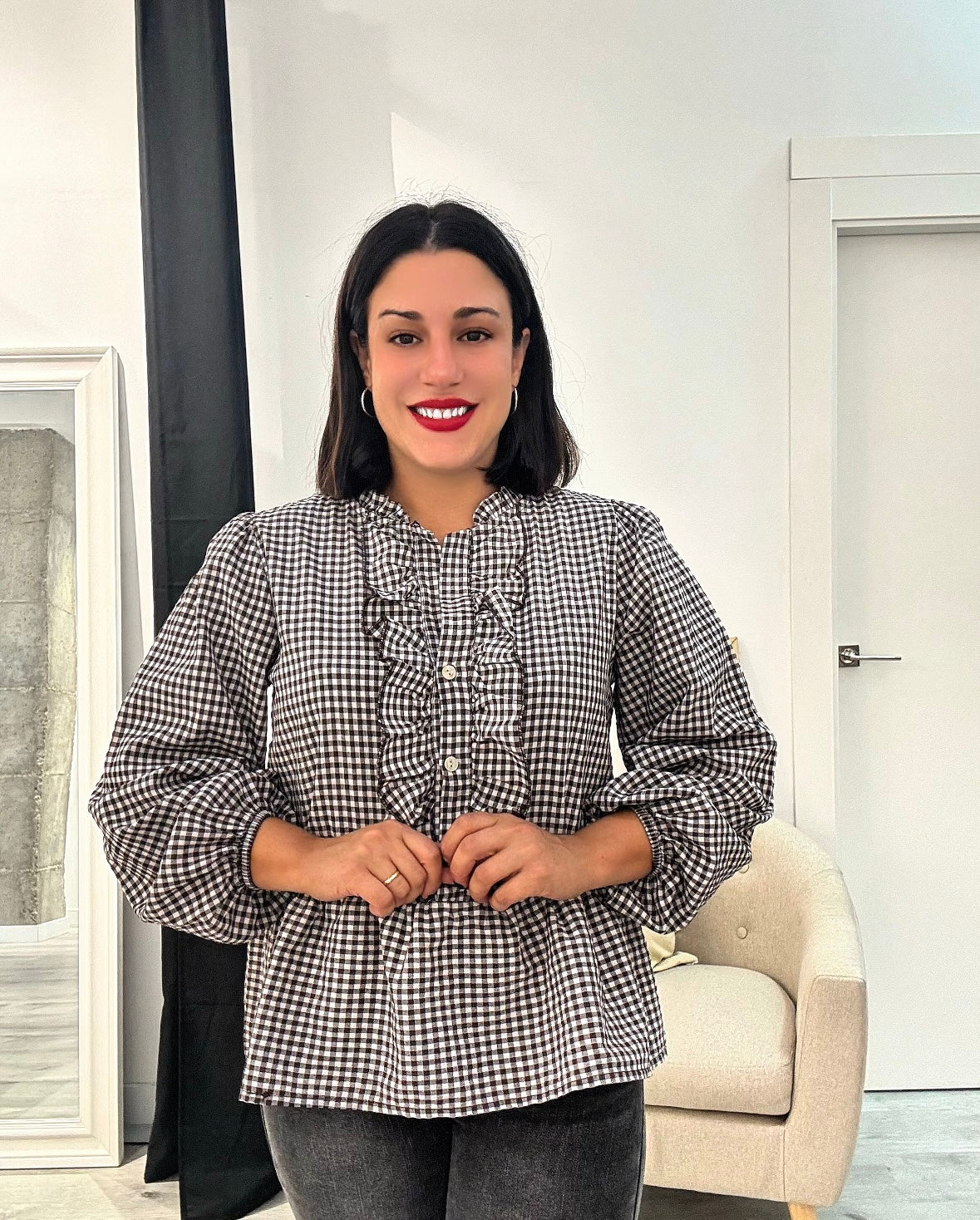 Camisa de cuadro vichy en tono marrón, con delicadas chorreras que le dan un aire romántico y especial. Única, con mucho carácter y encanto vintage, perfecta para destacar con estilo y personalidad 🍂👑.